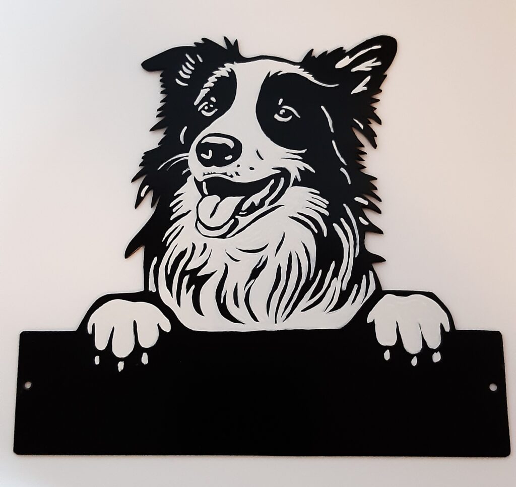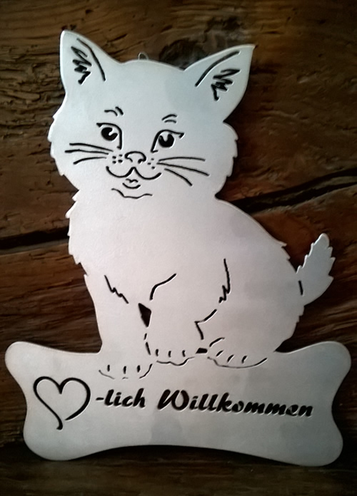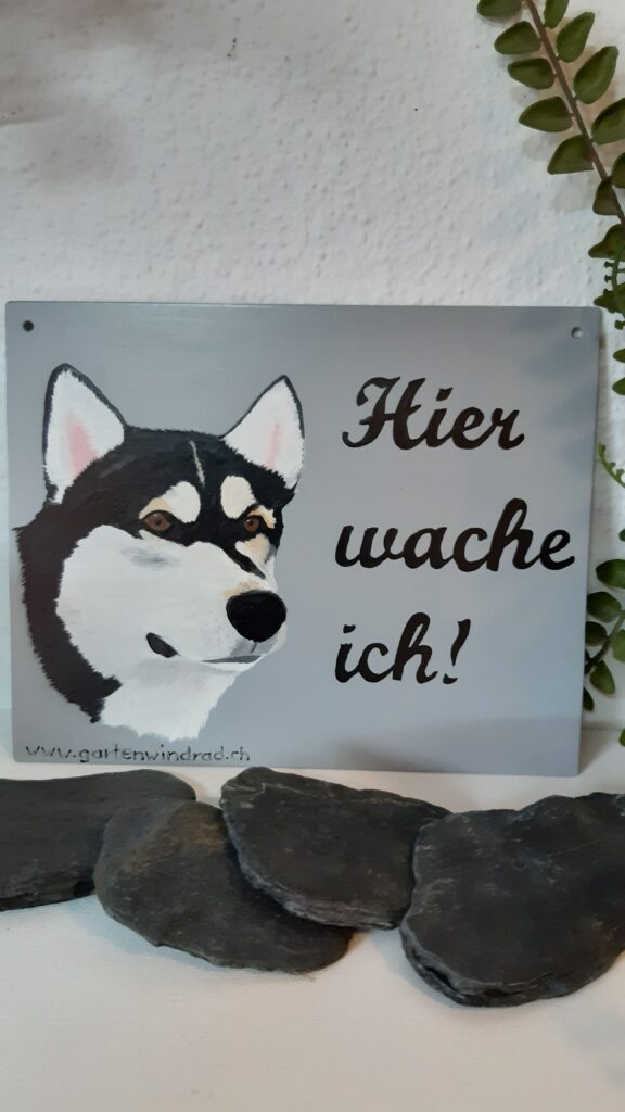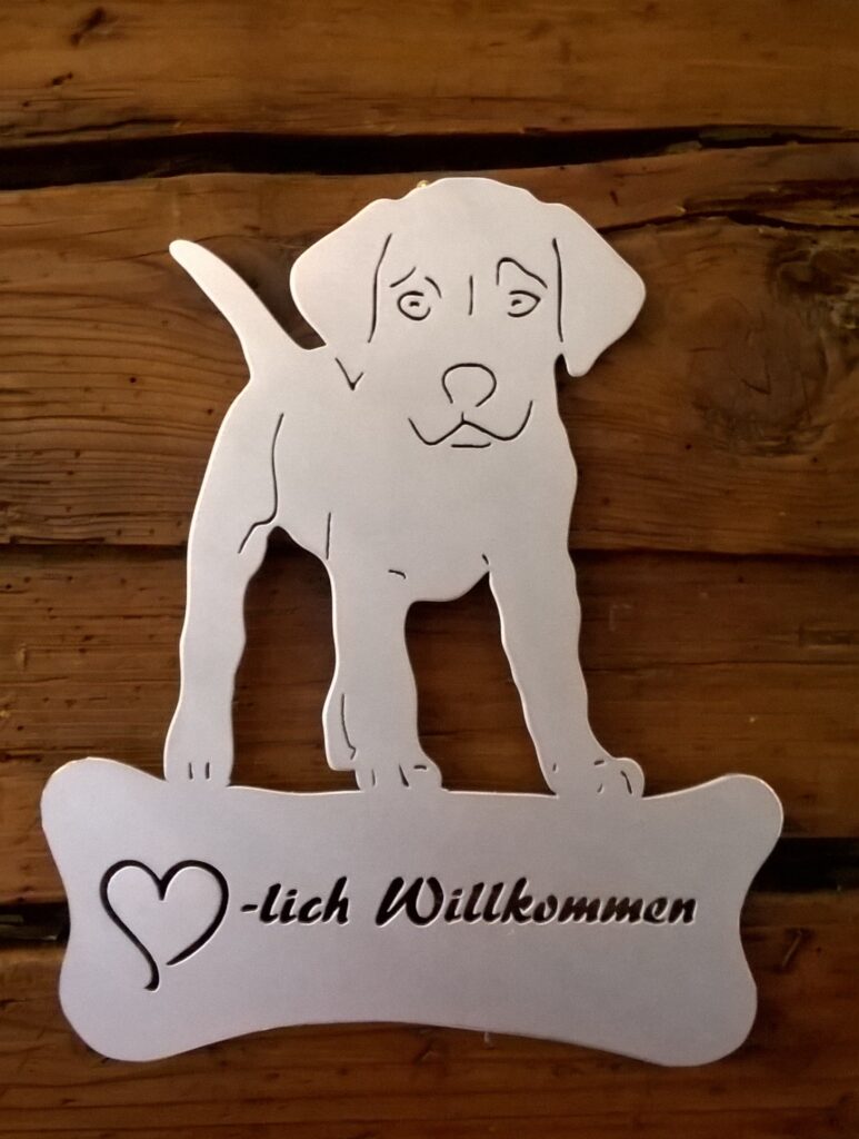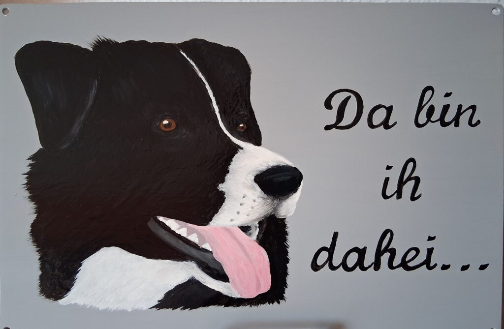 Aus 2mm-Aluminiumblach, jeweils in der Grösse 20 x 25 cm oder nach Anfrage. Türschilder mache ich Ihnen gerne auf Wunsch, auch nach Fotovorlage ihres Vierbeiners! Preis ca. Fr. 75.–